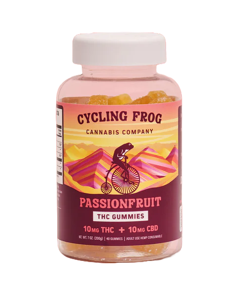 The newest addition to our edibles line, Cycling Frog Passionfruit 1:1 THC+CBD gummies provides the perfect full-spectrum balance of THC+CBD. With 10mg of both and lots of other beneficial cannabinoids packed into each delicious gummy, Cycling Frog 1:1 THC+CBD gummies are designed so you can find your own perfect balance.