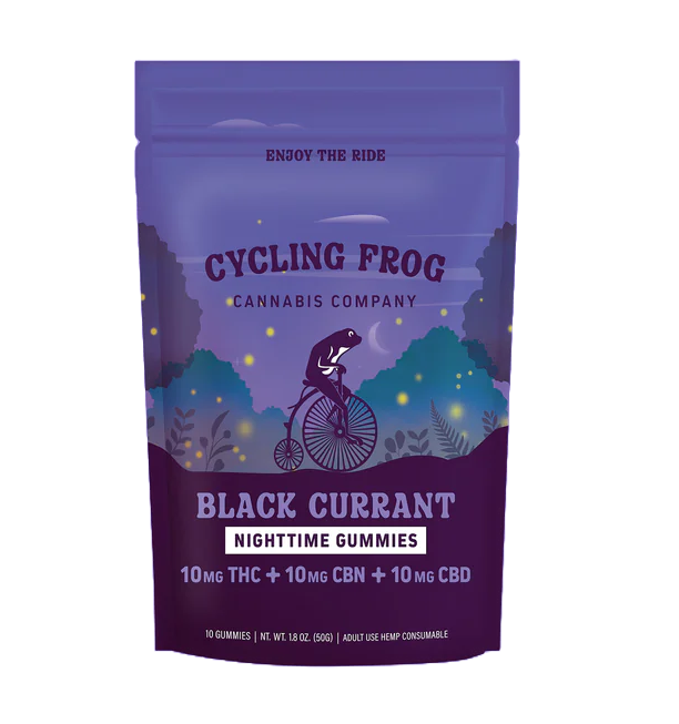 Settle into your evening routine with Cycling Frog Gummies Black Currant 10MG THC 10MG CBD 10MG CBN that blend THC, CBD, and CBN in a smooth 1:1:1 ratio. Each bite supports calm, comfort, and steady relaxation. As your night slows down, this trio helps your body release tension while your mind gently quiets.