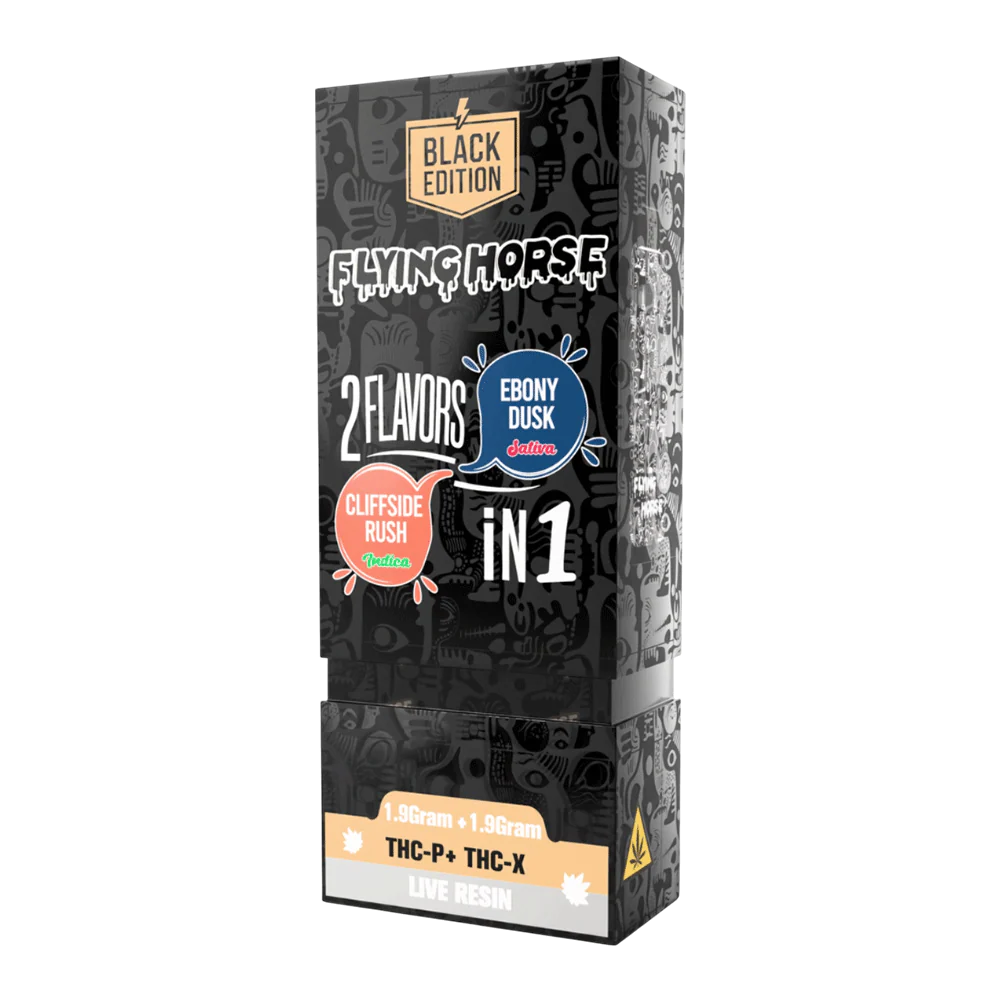 Meet the ultimate 2-in-1 vape experience. The Flying Horse Black Edition 2in1 Disposable Ebony Dusk Cliffside Rush 3.8 packs two distinct moods in one elegant device. Take a slow, flavorful inhale of Ebony Dusk to unwind, then flip to Cliffside Rush when you need clarity, energy, and focus.