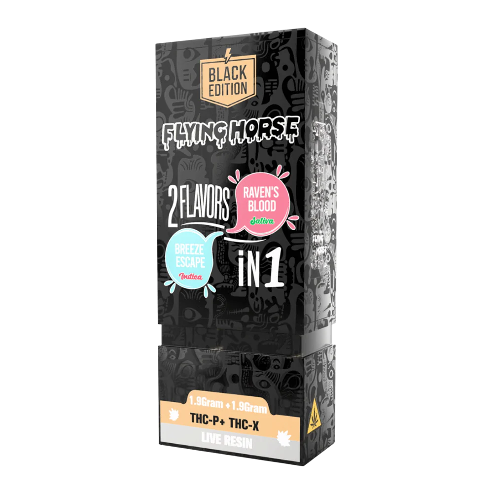 Experience the ultimate dual-strain vaping with the Flying Horse Black Edition 2in1 Disposable. Start with Ravens Blood for an uplifting, social vibe, then switch effortlessly to Breeze Escape for a calming, serene exhale. Each puff delivers smooth, full-spectrum live resin with potent cannabinoids like THC-P and THC-X.