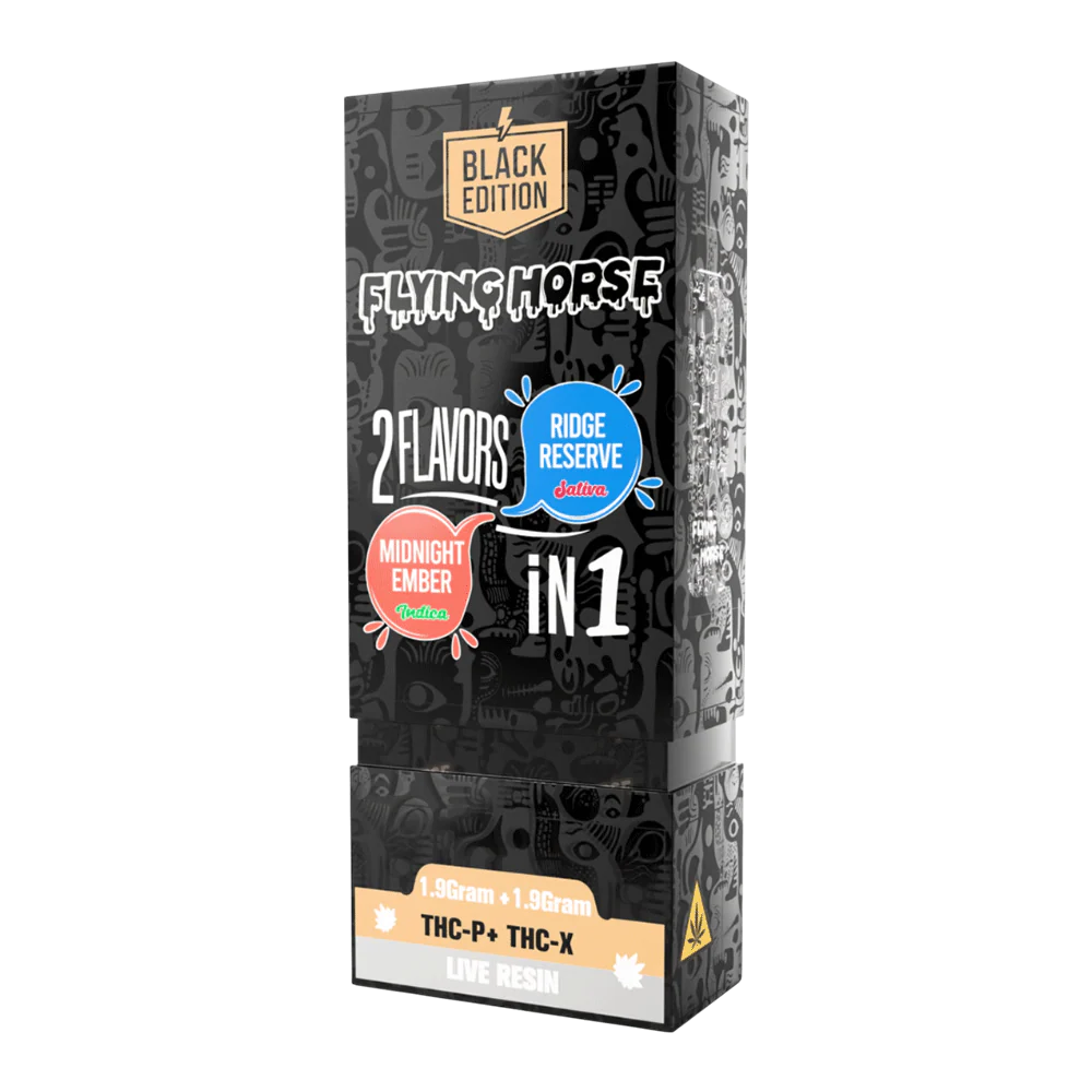 The Flying Horse Black Edition 2in1 Disposable Ridge Reserve Midnight Ember 3.8 offers two premium live resin strains in one device. Enjoy Ridge Reserve’s earthy balance or Midnight Ember’s deep relaxation anytime. Switch flavors instantly, recharge with USB-C, and enjoy smooth, clog-free hits.