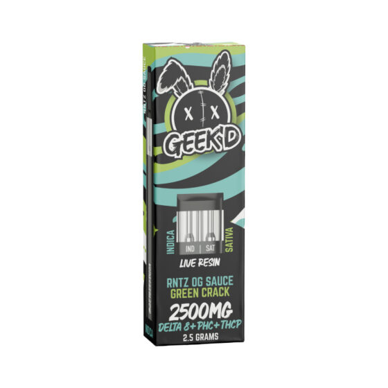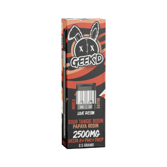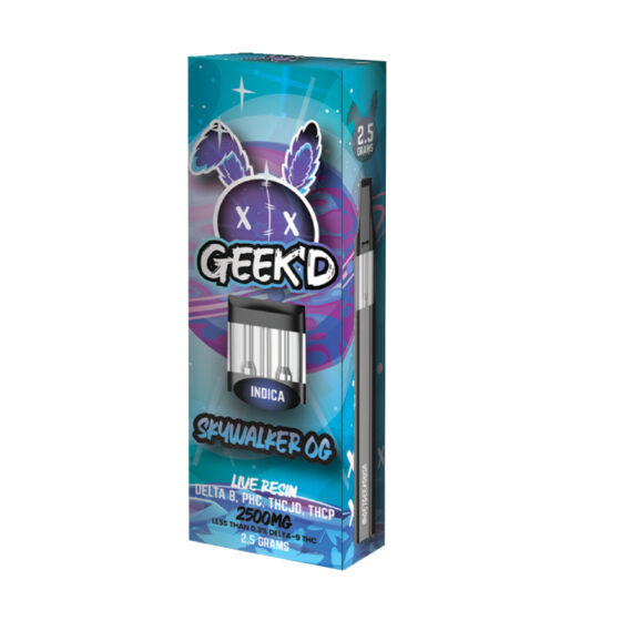 Geek’d has redefined the disposable vape with their Live Resin Delta 8 THC Vape Pen with PHC + THCJD 2.5g. Each device houses a unique dual-strain experience—Indica and Sativa—allowing you to switch between two completely different vibes. The result? Total flexibility at your fingertips.