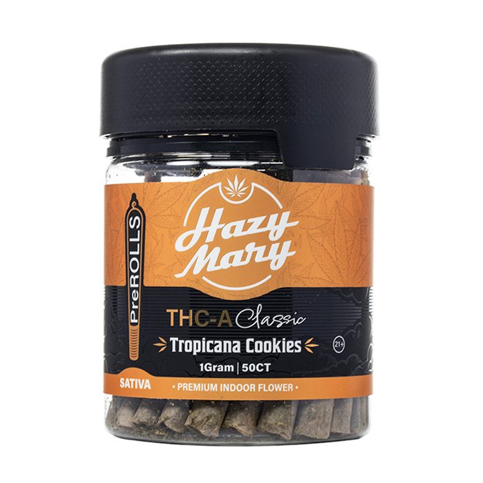 Light up any moment with this powerhouse jar of pre-rolls. Hazy Mary THCA Classic Pre Rolls make it easy to enjoy premium cannabis without the grind or roll. Tropicana Cookies Sativa offers an energetic, mood-boosting experience with a sweet, citrus aroma.