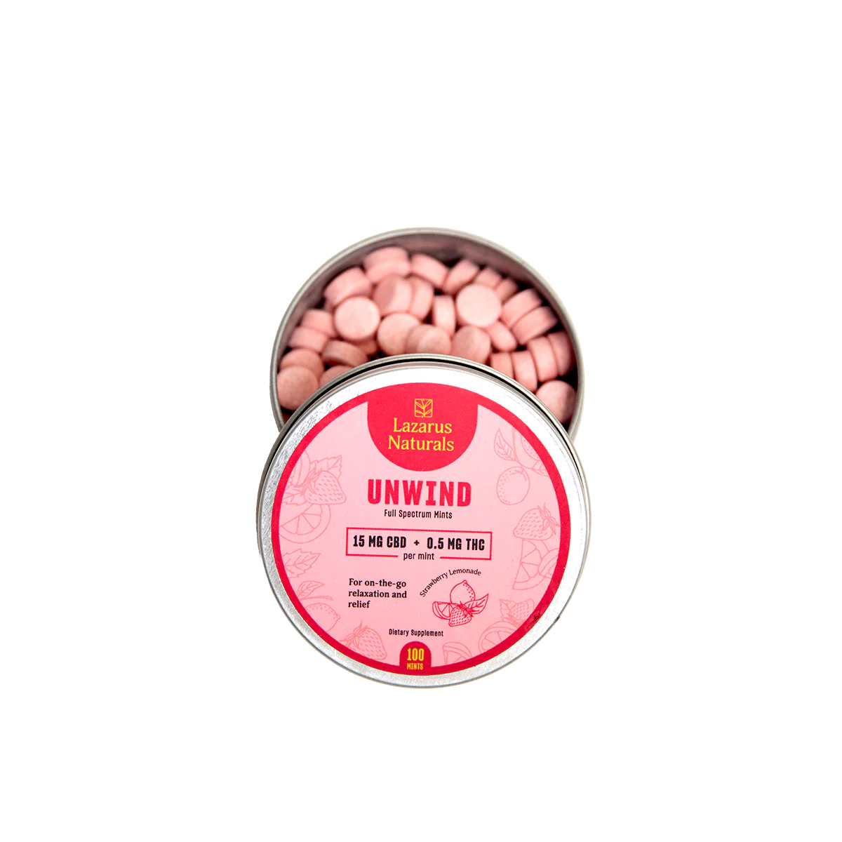 Lazarus Naturals Unwind Mints – Strawberry Lemonade – 15mg CBD + 0.5mg THC per Mint – 100ct Tin