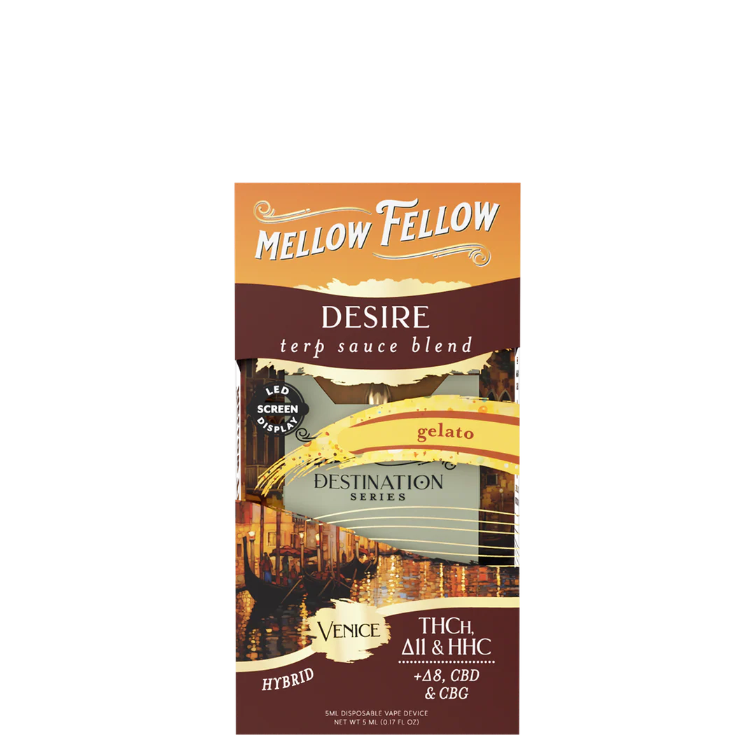 The Mellow Fellow Desire Blend Terp Sauce 5ml Disposable Vape Gelato Hybrid is a premium vaping experience designed to awaken your senses and unlock your creativity. This expertly formulated blend features six powerful cannabinoids—HHC, Delta 8, Delta 11, CBD, CBG, and THCh—all derived from hemp and lab-tested for purity.