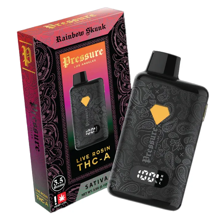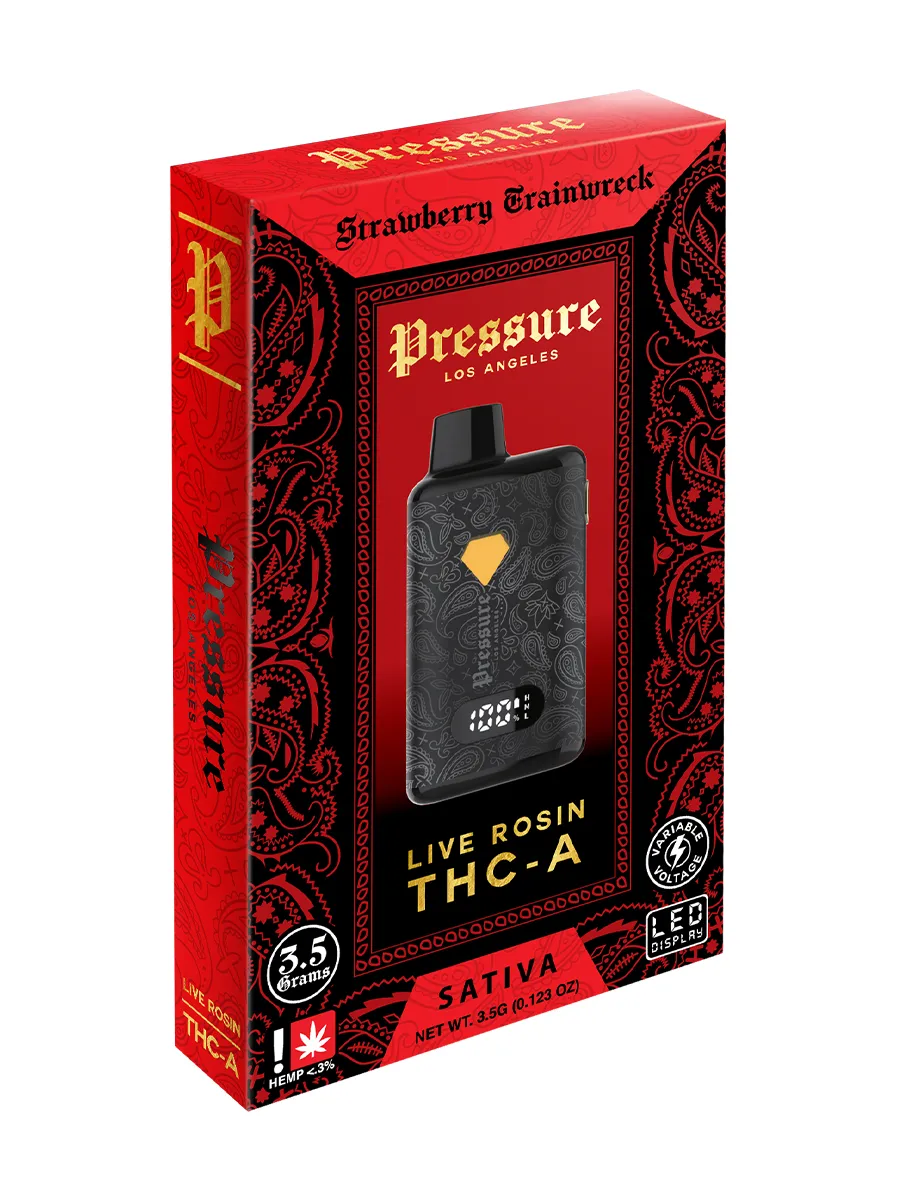 The Pressure Los Angeles Live Rosin THCA Disposable Vape 3.5g delivers bold flavor with lasting strength. First, the device packs 3.5 grams of premium THCA oil. As a result, sessions feel smooth and consistent. Moreover, strain-inspired terpene blends create rich aroma and taste.